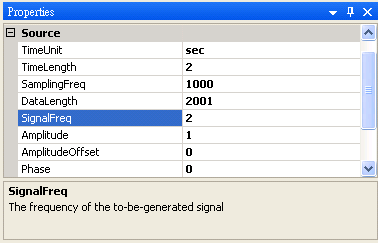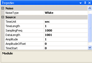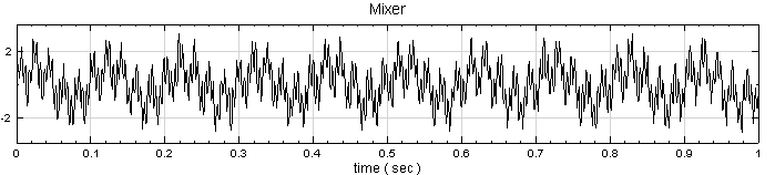 Network 視窗下選擇 Source / Noise 產生一個白色雜訊,設定 Properties / Amplitude 為 0.3,再用 Source / Sine Wave 產生三個 Sine Wave,並改變其 Properties / SignalFreq 為 10、51、193Hz,最後以 Compute / Channel / Mixer將上述訊號混合(將各訊號源之Output 拉至 Mixer 的 Input),用 Viewer / Channel Viewer 繪出。
