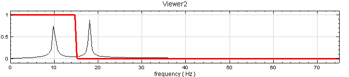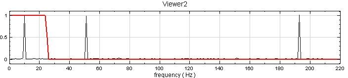 於 Mixer 圖示選擇 Compute / Filter / FIR Filter,調整 Properties / F1 為 25Hz,FilterType 預設為 LowPass,用 Channel Viewer 顯示濾波結果。觀察結果,輸入訊號在頻率 25Hz 以上的部份皆被濾除,輸出訊號類似 10Hz 的 Sine Wave,不過因 FilterOrder 僅101,所以波形有所影響。