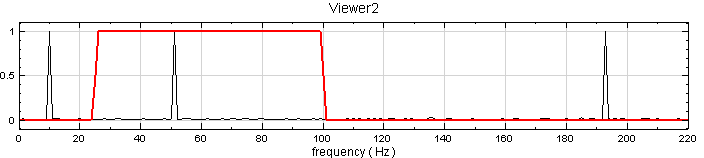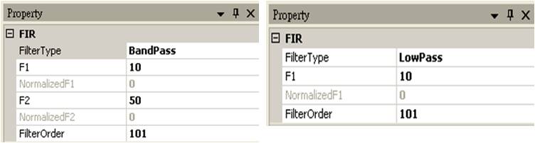 再重覆步驟 2 新增一 FIR Filter,調整參數 FilterType 為 BandPass,F1 改為 25Hz,再設定頻率下限 F2 為 100Hz,FilterOrder 設為 500,在頻段 25~100Hz 的訊號會通過,其它訊號則被濾掉,所以結果為 51Hz 的 Sine Wave。