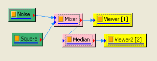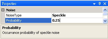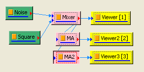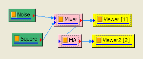 於 Network 視窗下按右鍵,選擇 Source / Noise 產生一個雜訊,設定 Properties / NoiseType 為 Speckle,Probability 設為 0.25,另外選擇 Source / SquareWave 產生一方波,以 Compute / Channel / Mixer 將兩訊號混合,用 Viewer / Channel Viewer 顯示於視窗。
