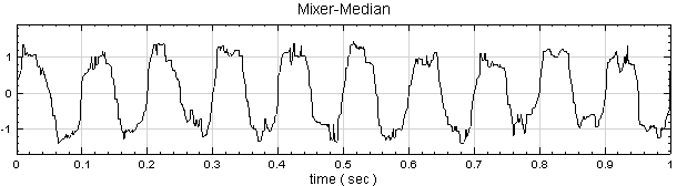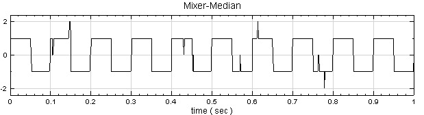 最後回到 Noise 圖示,將 NoiseType 由 Speckle noise 改為 White noise 藉此測試 Median filter 的特性,結果如下,可觀察到 Median filter 無法完全過濾 White noise 造成的影響,但波型邊緣仍大部份維持著,此即為 Median filter 的主要功用。