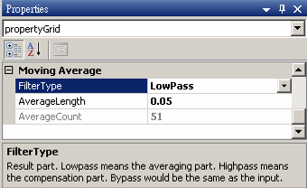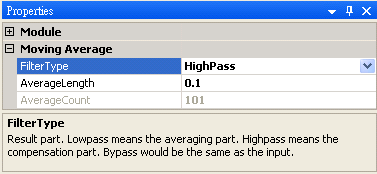 Moving Average Filter 包括兩個參數:FilterType 與 AverageLength,AverageLength 代表求平均所取的訊號個數 M,單位為時間。FilterType 為設定濾波器高、低頻段的過濾,內有三個選項分別為 LowPass、HighPass 及 ByPass,LowPass 即為執行上述理論的計算值;HighPass 則為輸入訊號減去 LowPass 之計算結果;而 ByPass 的輸出,即等於輸入訊號(因為 HighPass + LowPass = 原訊號),參數預設值詳見下表。