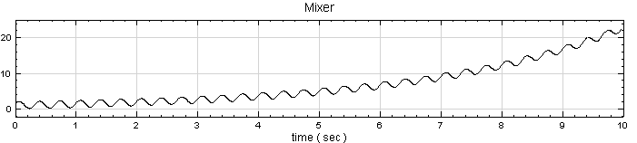 建立一個 Sine Wave,設定時間長度為 10秒,頻率為 3 Hz;再建立一個 Custom Wave,在 expression 內輸入 exp ( t / 3.2 ),同樣時間長度設為 10 秒。之後將此兩訊號以 Mixer 混合,並接上Channel Viewer 繪製圖形。