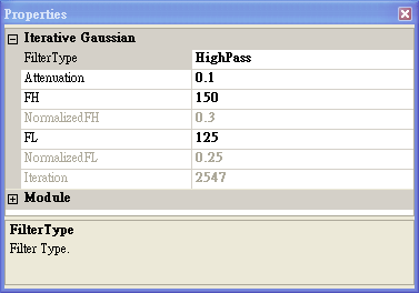 此 Iterative Gaussian Filter 的濾波形式 LowPass:低頻部分可通過,濾除高頻。 HighPass:低頻部分可通過,濾除高頻。 ByPass:無任何頻段訊號被濾除。 |
