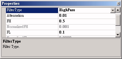 對於 FilterType 選擇 BandPass 與 BandStop 者,會出現濾波器過濾頻段不終點 F2,單位為 Hz。 |