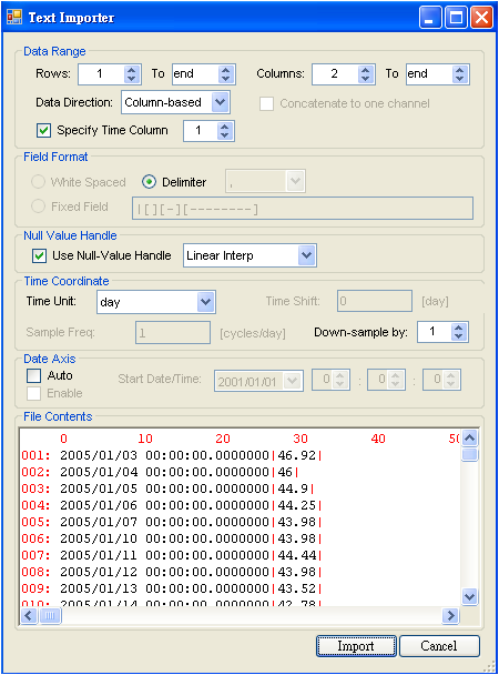 最後要將日期資訊取代現有的時間軸,將 regular 訊號轉成 Indexed 訊號,利用 Text Importer 再開啟 CSV 檔案,Data Range / Specify Time Column 為 Checked,和 Columns: 2 to end,讀取進來訊號屬於 Indexed,時間單位為 day。