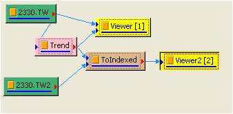 最後將 Trend 運算結果連接 Conversion / Convert to Indexed,接下來將剛才讀取進來的 Source (2330.TW2) 也連接至 Convert to Indexed,最後將 Convert to Indexed 連至 Viewer / Channel Viewer 展示,可以看見有日期的資訊出現在 X 軸,並可以根據當時發生的事件去推斷股價趨勢變化。