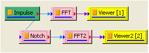 在 Impulse Source 後面接上 Computer / Filter / NotchFilter,在 Notch 後面接上 Computet / Transform / Fourier Transform,最後以 Channel Viewer 觀察頻率分佈 可以清楚看見濾除 60Hz。