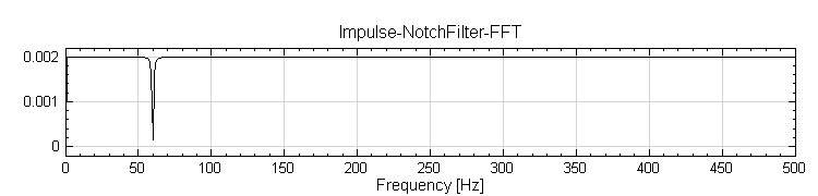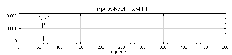 Notch Filter 的主要濾除某一特定頻率,若假設濾波器設計為濾除為 60 Hz 的訊號,其 Frequency Response Function 如下圖。