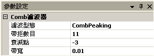 改變 Comb Filter 中 FilterType 為 CombPeaking,以及 NotchNum 為 11,濾波結果為保留一系列的頻率,其他則濾除。