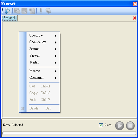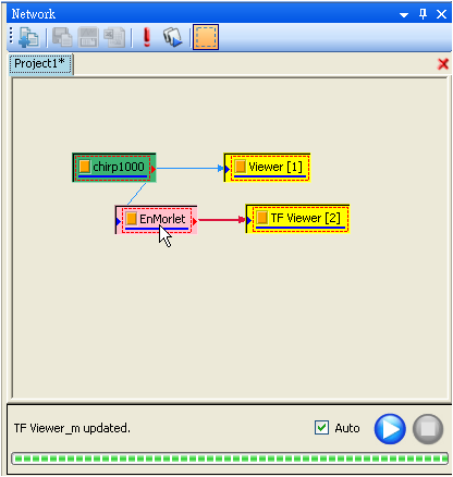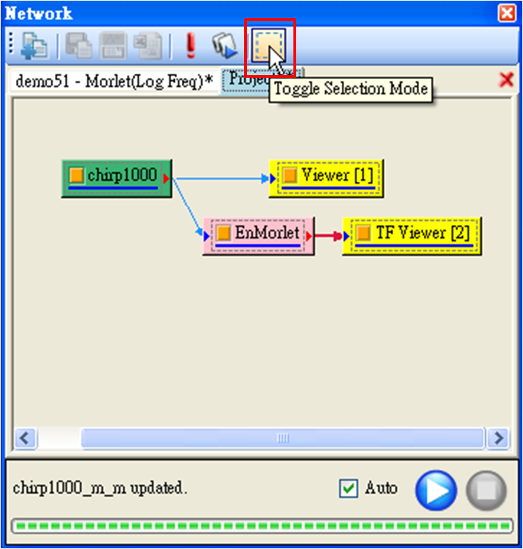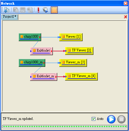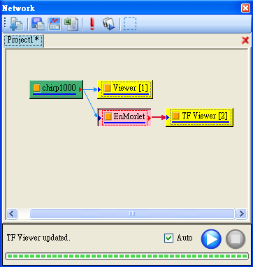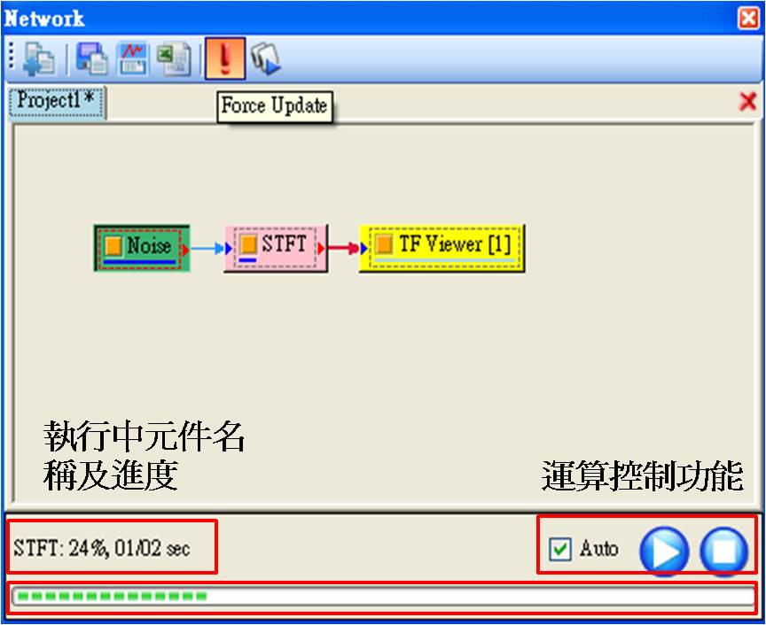 此功能可決定程式是否會即時更新計算。當 Auto 被勾選時,使用者改變元件參數後,程式會馬上重新計算該元件以及接於該元件輸出埠以下的所有元件。而使用者常碰到一種狀況是不只修改一個元件的參數,此時可取消勾選 Auto,等到各個元件都修改完畢後,再按下