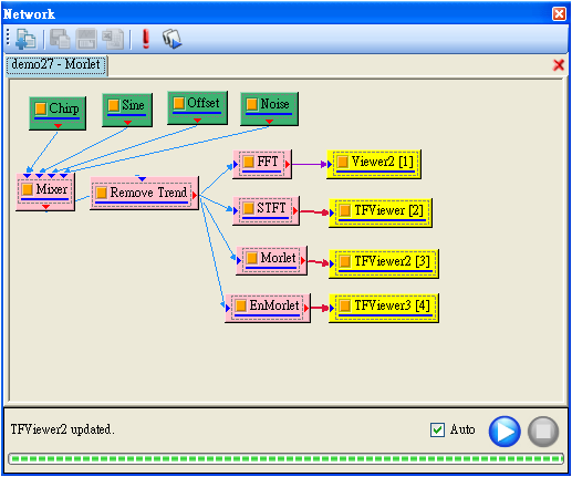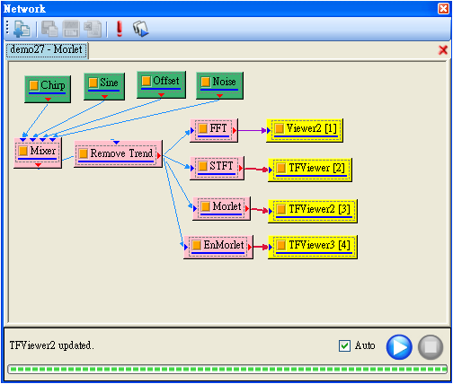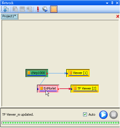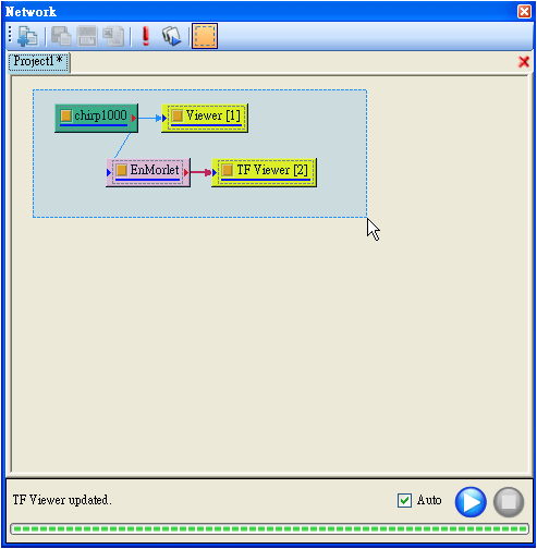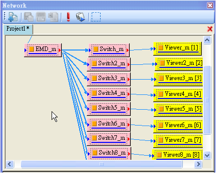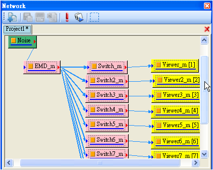 Network 視窗為連接各種元件的區域,在這裡可執行各種元件,以滑鼠拖曳的方式連結各元件,快速且直覺地組合出訊號處理所需的計算分析流程。
