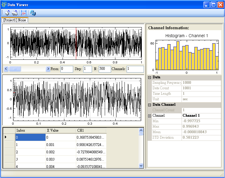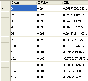 Data Viewer左下半部的表格部份顯示訊號的內,訊號資料依時序排列為一行,不同列 ( row ) 代表不同的時間。第一行標題為 Index,是訊號每個資料點的編號,再來是 X Value,是訊號每個資料點所對應的時間點;之後每行代表各通道訊號的資料,以上圖為例,此訊號是單通道訊號,因此資料只有 CH1 一組,若訊號為多通道,則會依照通道編號 CH1、CH2… 依序排列。訊號資料的個數、位置與在繪圖區設定的放大範圍一致,當使用者調整範圍或是改變捲軸的位置,表格內容都會即時的更新,讓使用者在看圖之餘,能馬上比對圖上的數據。