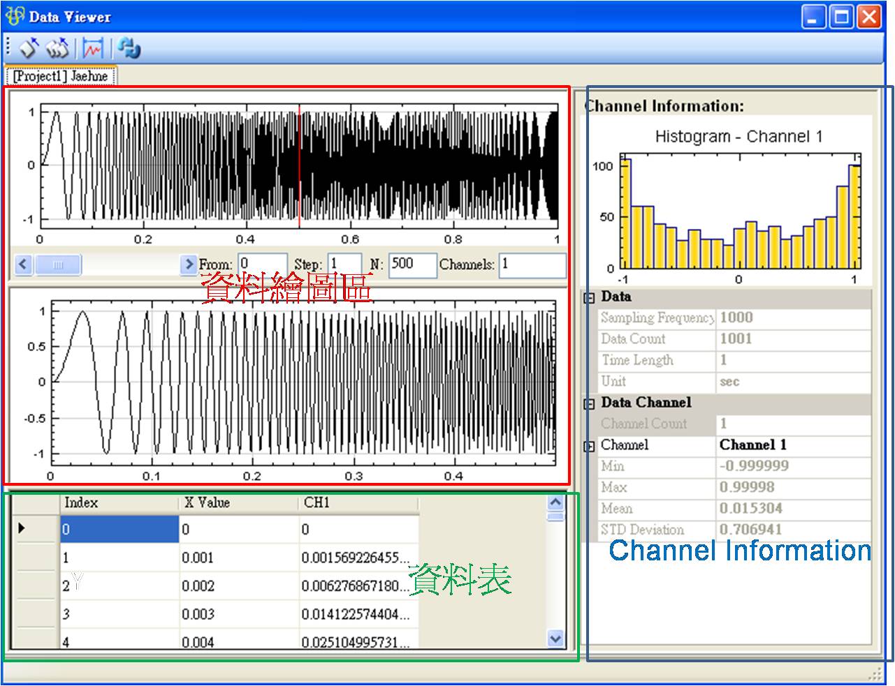 Data Viewer 右邊即是 Channel Information 視窗,會顯示資料的相關資訊。Histogram 是簡單的統計直方圖,橫軸為訊號資料值的範圍,程式會將訊號資料值分作21等分,縱軸是資料數量,每一個長條柱就代表資料值落在該區間的資料點個數。