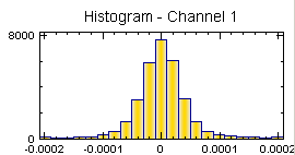 Histogram 顯示統計的直方圖,X 軸為資料數值的範圍;縱軸為單一區間下資料出現的個數。由於頻譜訊號能夠以多通道訊號儲存,所以可調整參數 Channel 計算訊號不同通道的統計值。下圖為頻譜訊號的 Histogram 與相關統計值。