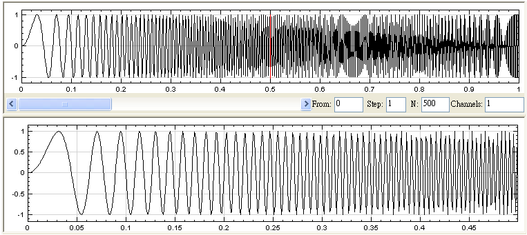 以上圖為例,繪圖區第二張圖是從訊號第 1 點 ( 編號為 0 ) 開始算,總共 500 點的訊號,而且沒有 down-sample。