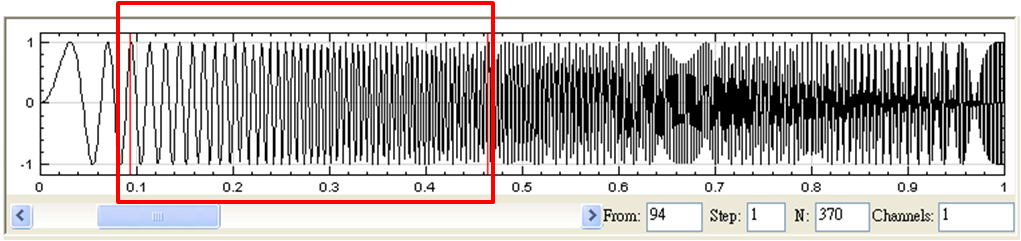 使用者利用訊號的位置精確指定放大範圍後,可以在圖上看到紅色線,紅色線內的範圍即為剛選擇的區域,使用者選擇範圍可以利用時域圖下方的捲軸,或在時域圖上利用按下滑鼠左鍵拖拉方式選擇,就能夠調整放大範圍的位置。若是按下