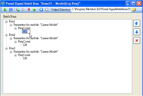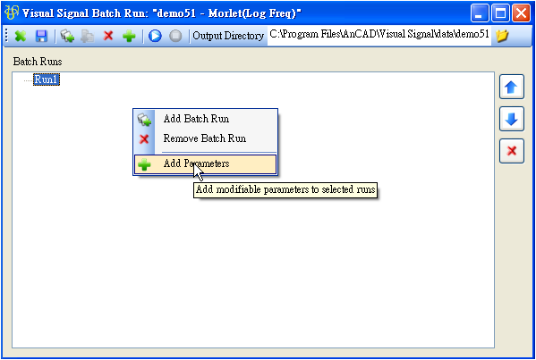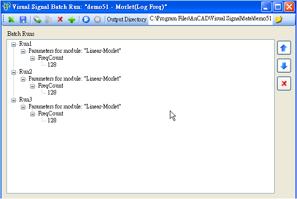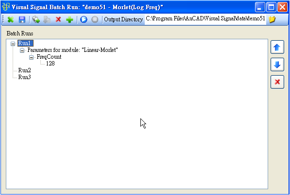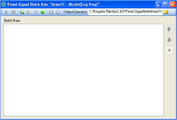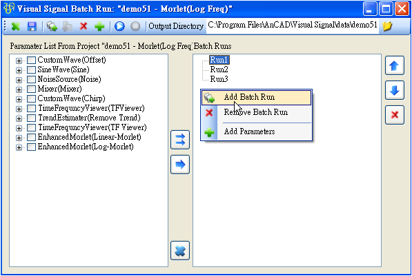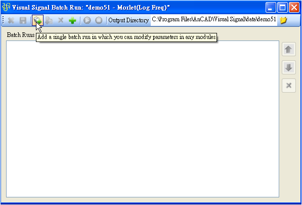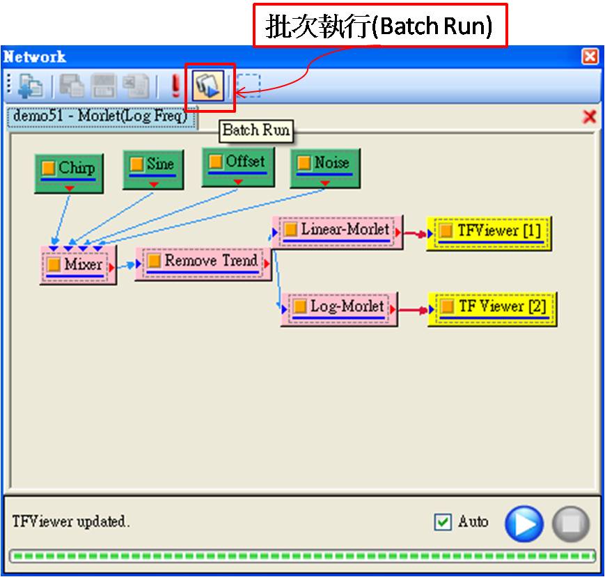 Batch Run(批次執行),對一個已儲存的專案,若需要以許多不同的資料檔跑一樣的訊號處理程序,或者針對同一個專案改變不同的參數計算,可以利用 Batch Run 功能作批次處理,按鈕在 Network 工具列的最右方。將以 demo 51 為例,介紹 Batch Run 的介面與用法。