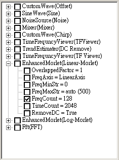 接著在右邊就是改變參數,在左邊視窗選擇 EnhancedMorlet ( Linear-Morlet ),點擊樹狀圖的加號 + 即可以看到該元件下所有的參數,並勾選將要改變的參數,例如現在選擇 FreqCount,然後再按下