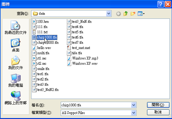 首先點擊 Network 工具列的 Open Data From File,至 Visual Signal 安裝目錄下(預設為 C : \ Program Files \ AnCAD \ Visual Signal \ demo \ Basic ),選取檔案 Chirp1000.tfa。