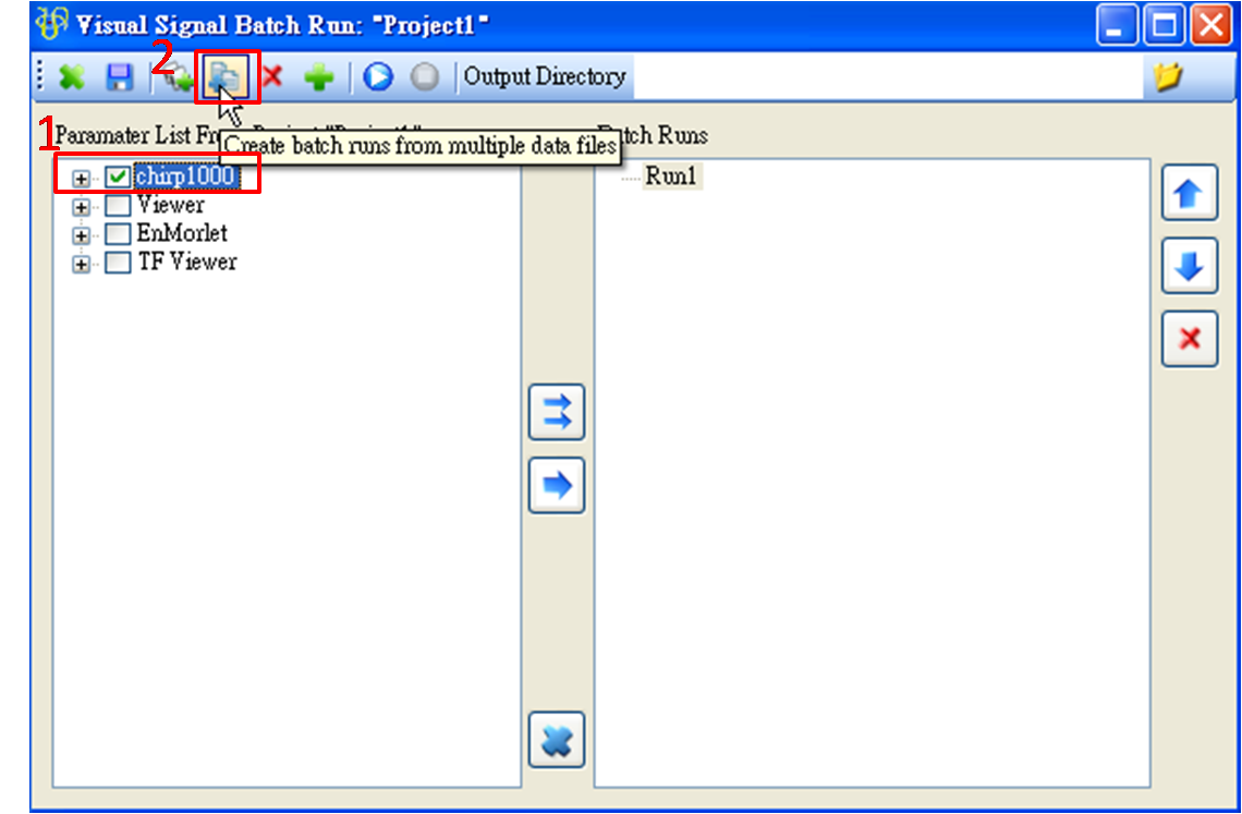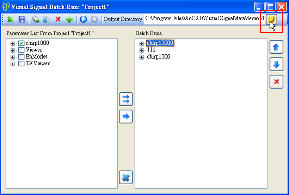 假設訊號資料檔已經選取完畢,在執行 Batch Run 之前要再檢查輸出檔路徑( Output Directory )。Output Directory 預設是與 .VSN 專案檔的目錄相同,由於本專案尚未存檔,因此要自行設定輸出檔的路徑,點下按鈕