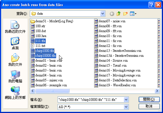 本例選取 111.tfa、chirp1000.tfa 與 chirp10000.tfa 作為批次計算的資料檔再按下開啟。這時候在 Batch Runs 區會自動新增三個 Runs,如要再加資料檔,只要用