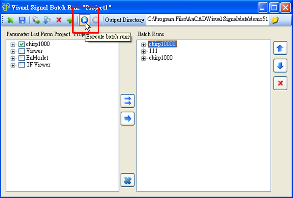 首先由主視窗工具列上Open Project 開啟 C:\ Program Files \ Ancad \ Visual Signal \ demo \ Extended 中的 demo 51,然後在按下Batch Run 按鈕,視窗如下圖: