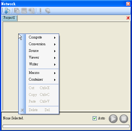 在元件編輯視窗中點擊右鍵會跳出模組元件的功能選單,所有模組元件都必須由此選單中叫出。模組依照功能與運算內容細分為五大類,分別是 Compute 計算群組、Conversion 轉換群組、Source 訊號源群組、Viewer 展示群組與 Writer 資料輸出群組等,其中 Compute 計算群組下又依照計算方法細分為 Channel、Filter、Math、TFA、Transform 等模組以及外掛的特殊模組 ( DAQ、SVM 等模組),各群組之特性說明如下。