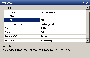 若是改變STFT 的參數 TimeCoant 或FreqCount,則STFT 會根據新設定的網格數量重新計算,因此會影響計算結果的解析度以及運算時間。現在改變 TimeCount 為 50,則運算速度變快,但結果的解析度亦變差。
