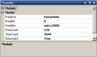 本模組接受實數(real number),單通道(single channel),regular的訊號(signal)、聲音訊號(audio)輸入;輸出訊號格式為實數,單通道,regular的時頻(spectra)資料。參數須設定起始與終點位置,其單位等於輸入訊號的時間單位。