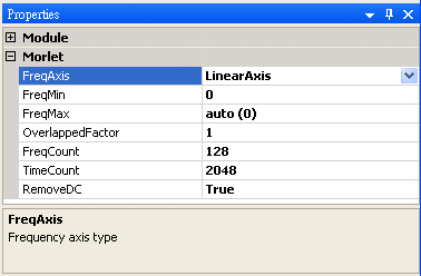 時頻圖頻率的分佈可以設定為是 LinearAxis (線性尺度)或是 LogAxis ( 對數尺度),LogAxis 多用於聲音訊號分析。 |