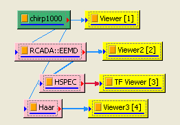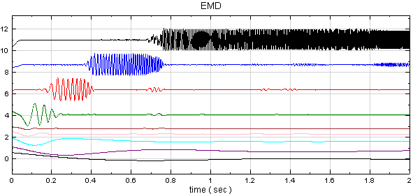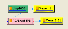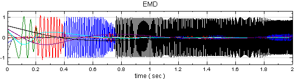 在 Chirp_1000後接上 Compute / HHT / RADAC EEMD計算出 IMF (Intrinsic mode function),再以 Viewer / Channel viewer 繪出。