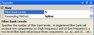 Hilbert Spectrum 也可由 Haar Wavelet Transform 計算瞬時頻率。在 Chirp_1000 後方接上 Compute / Transform / Haar Wavelet Transform,再把 Properties / FilterBank levels 調為 9,Resampling method選 Spline,最後仿照步驟 2~3 進行時頻計算。