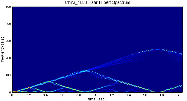 Hilbert Spectrum 利用Hilbert Transform,計算訊號每個時間點的瞬時頻率與瞬時震幅,並輸出為 時間-頻率 的矩陣。在 HHT 過程中,EMD後將 IMF 由訊號中提取出來後,我們可順利的把Hilbert Transform 應用在各個 IMF 上,觀看 Hilbert Spectrum 得出之時頻分析結果。利用模組 Haar Transform 之輸出結果也可直接接上 Hilbert Spectrum。