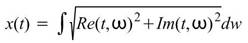 ,針對頻率軸積分,得到以時間為參數的分佈。數學上,這樣的操作可寫為: