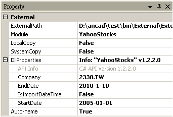 再開啟一個 ExternalDll,ExternalPath 中開啟 ExternalDllDemos.dll ( C:\Program Files\AnCAD\Visual Signal\External\External\ExternalDllDemos.dll ),最後將 Module 選擇為 YahooStocks,這個 DLL 的 YahooStocks 將會至 Yahoo 將某個時段、某支股票的資料抓取下來 。