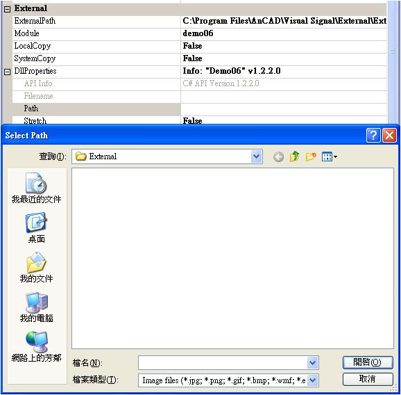 3. 所有設定可以參考 ExternalBase Class Library或 Visaul Signal 下 Help / Reference Guides / ExternalBase Class Library ,產生 DLL 範例可以參考 C:\Program Files\AnCAD\Visual Signal\External\api\cs\VSignalExternalDllDemo。