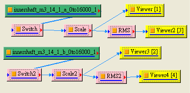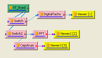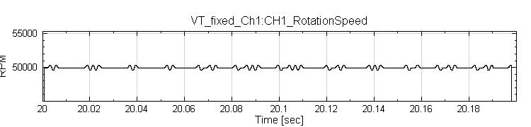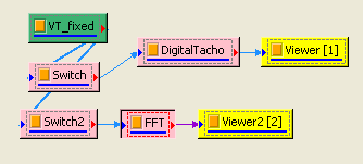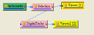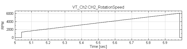 首先將原始訊號經過 Channel Switch,選擇 Tachometer 訊號再以 DigitalTacho 計算實際轉速,最後以 Channel Viewer 觀察轉速大約在 5000RPM 左右,如下圖。