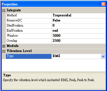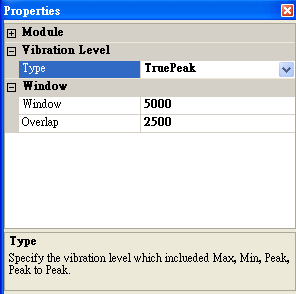 Vibration Level 中的 Type 選項定義如下,提供 Max、Min、TruePeak 和 TruePP 計算方法,預設的 Type = TruePeak。