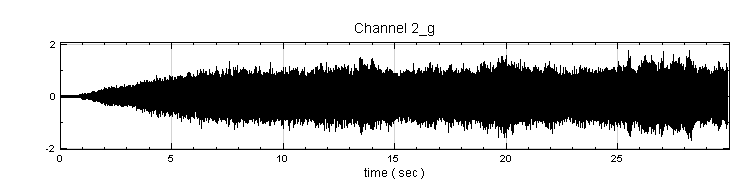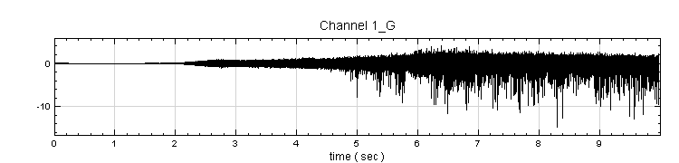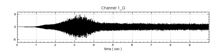 首先將電壓訊號經過 Scale 轉換,Properties/ Engineering Units 設定為 g,Properties / Sensitivity 根據加速規 Specification 設定 100.6 (mVolts/g),再以 Channel View 觀察,如下圖。