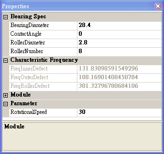 軸承損壞特徵檢測 (Bearing Defect) 為計算軸承損壞頻率工具,輸入軸承規格,則可以計算內外環或滾珠損壞的特徵頻率。
