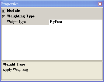 決定為何種權重濾波: By Pass:不執行任何濾波動作 A Weighting:聲壓準位在 20~55 dB SPL 範圍內建議使用。 B Weighting:聲壓準位在 55~85 dB SPL 範圍內建議使用。 C Weighting:聲壓準位在 85~140 dB SPL 範圍內建議使用。 Slope:權重為頻率乘上輸入值 (Slope Value) 。 |