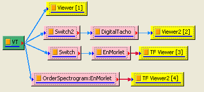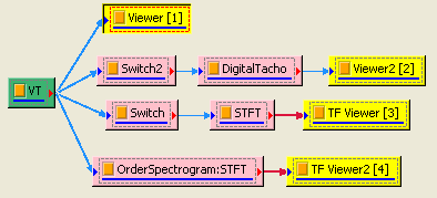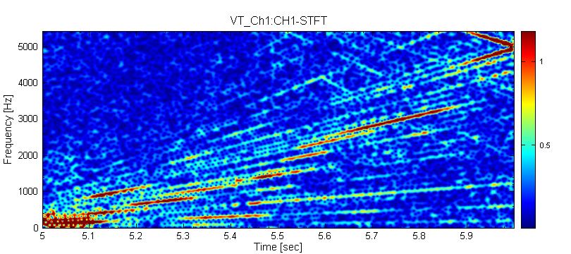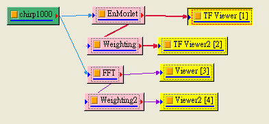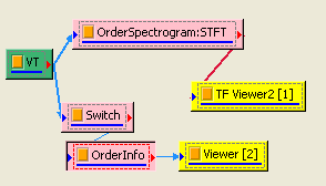 將 OrderSpectrogram by STFT 結果接至 Transpose Spectra 轉換之後,最後利用 TF Viewer 觀看其結果。