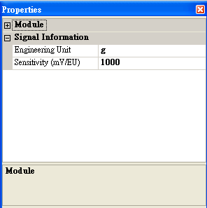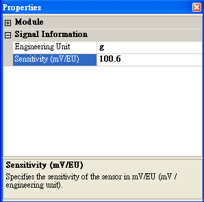 由感測器或儀器的 Specification 得知 Sensitivity,一般而言,其單位為 mV/EU,如加速規為 mVolts/g、麥克風為 mVolts/Pa等。 |