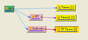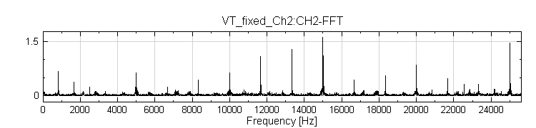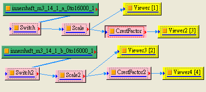 先用 Channel Switch 將選擇出振動訊號,再經由 Fourier Transform 處理,利用 Channel Viewer 觀察,可以發現似乎有許多倍頻。