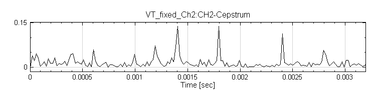 以下範例為 Cepstrum 分析固定轉速的迴轉機械的振動訊號,判斷有何種倍頻存在,請參考範例 C:\Program Files\AnCAD\Visual Signal\demo\SVM\Cepstrum.vsn。
