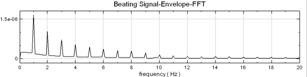 可以發現此撞擊訊號在頻譜以及時頻圖展現資訊並不是使用者所關注的,透過轉換為包絡訊號並且進行頻譜分析可以得到下圖。