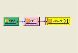 在此例中,FFT 的橫座標為 cycles per minute,現將 FFT 輸出接上 Change X AxisUnit,在Properties/ Abscissa unit 調為 Hz,然後再以 Channel Viewer 繪出。可看到 X 軸已變更以Hz 為單位。