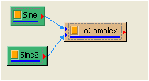 以 Source/ Sine Wave 產生兩個正弦波訊號,然後點選Sine2,修改 Properties / Phase 為 90,使 Sine2 變為餘弦波訊號。然後以 Comversion / Merge to Complex 合成一個複數訊號。