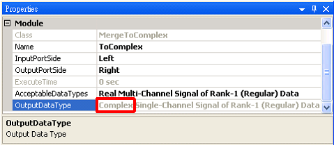再回到 ToComplex 元件,打開 Properties 下的 Module,裡面 OutputType 欄位內容訊號已變更為 Complex。